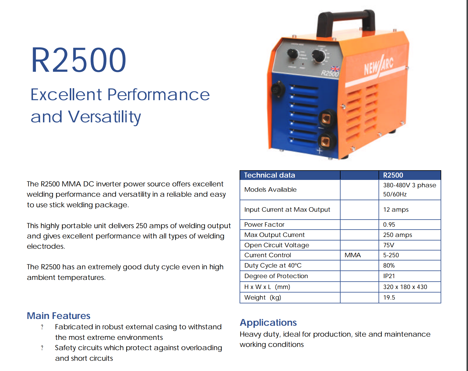 The R2500 offers excellent MMA performance and versatility in a reliable, easy-to-use stick welding package. The unit delivers 250-A output and high performance with all electrode types, and offers excellent duty cycle even in high ambient temperatures.