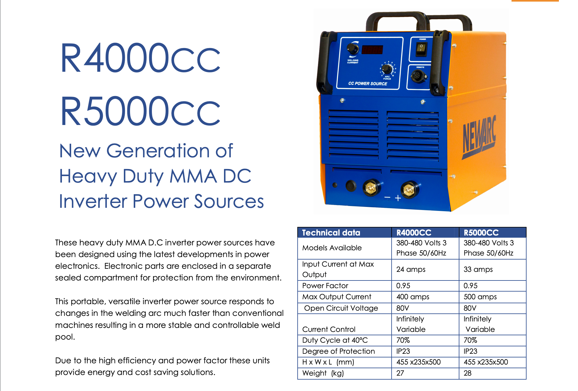 The R4000 and R5000 series of advanced inverter power sources are versatile, lightweight and portable. The CC units are designed for superior MMA and TIG welding with an external control unit( T300 HF unit ).