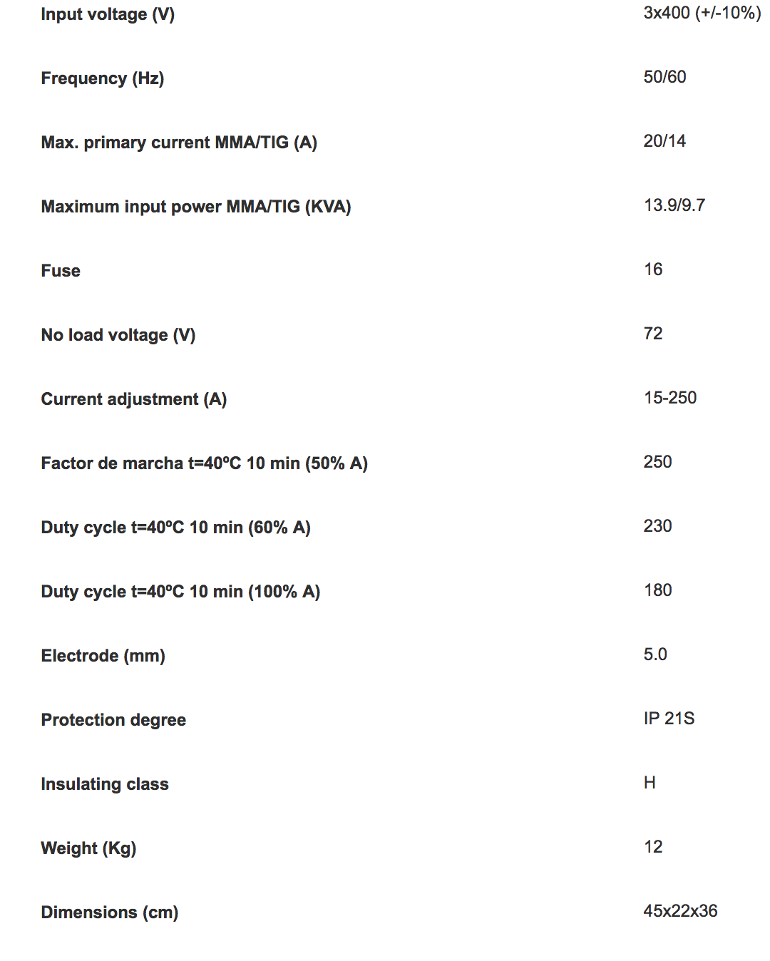 Three-phase inverter for MMA and TIG welding in direct current (DC). Dynamics functionality for constant thermal delivery and SPOT welding timer.