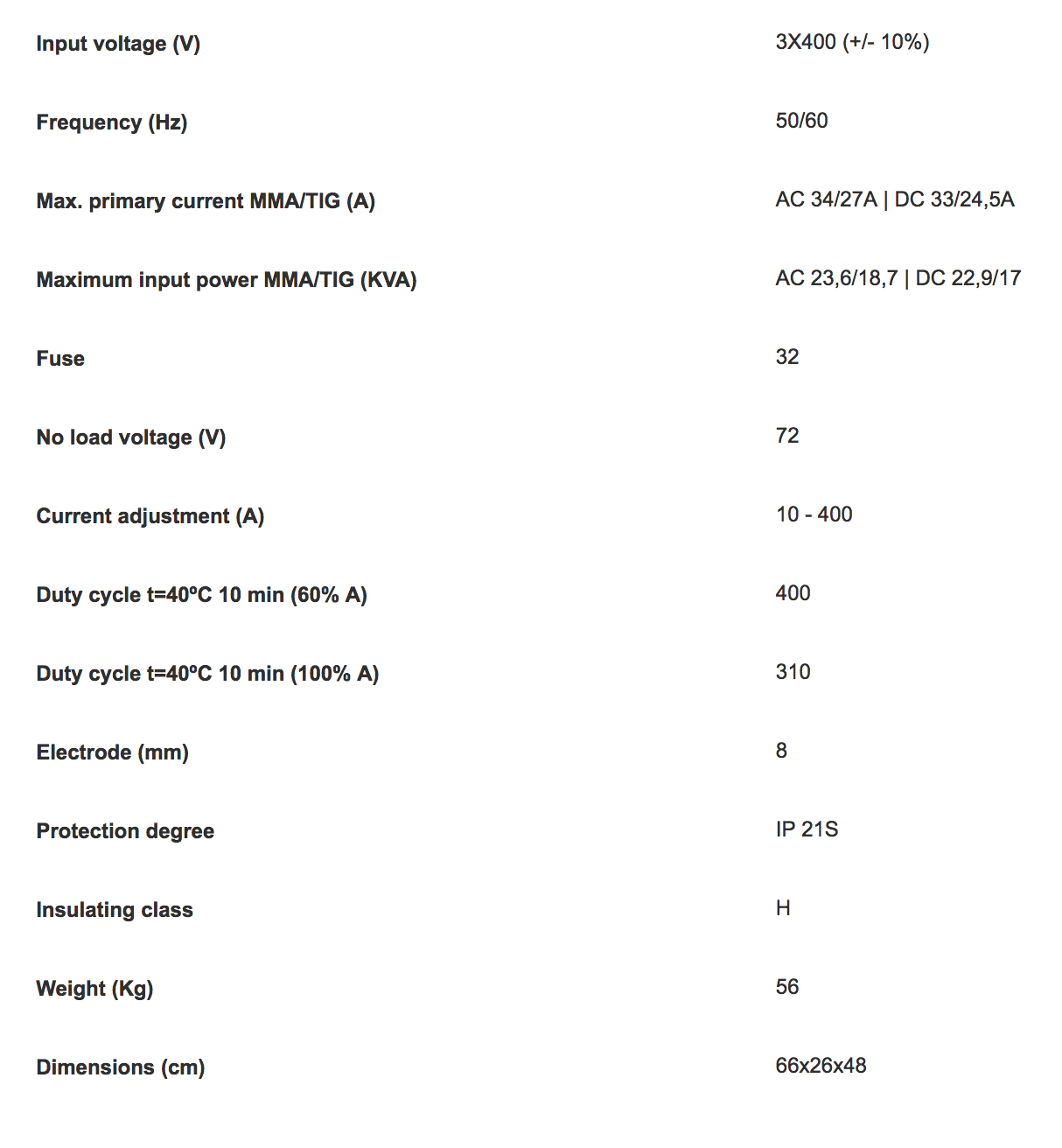 Three-phase inverter for MMA and TIG welding in direct current (DC) or alternating current (AC).